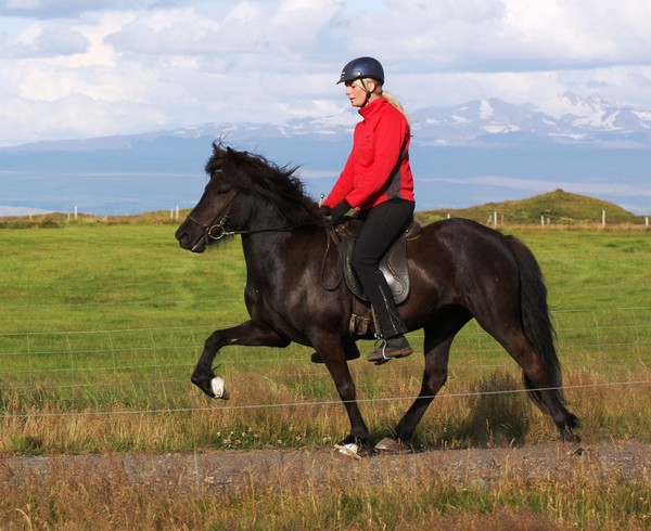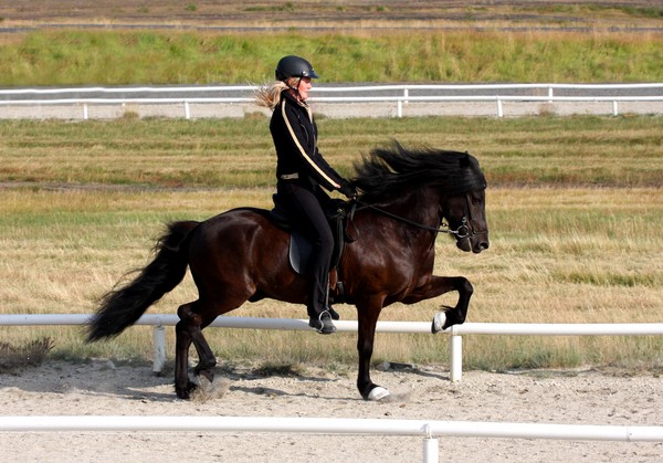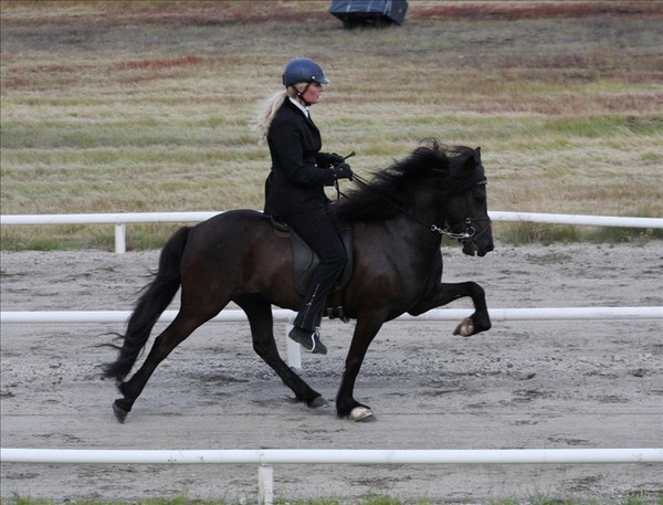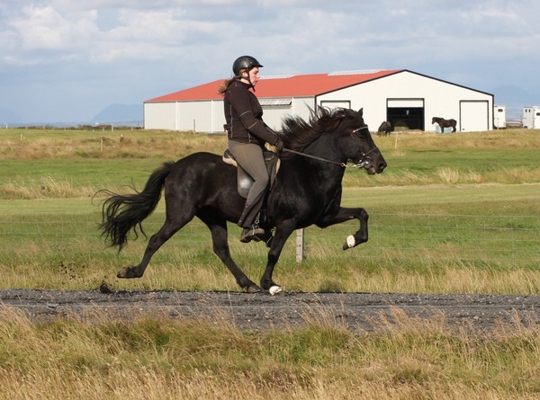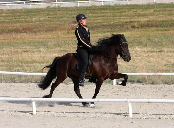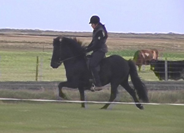 Zorro LM 2002 Zorro and his new owner Guðlaug, sumer 2009. | Zorró frá Álfhólum, fæddur 1996 Svartur. Seldur innanlands. Faðir: Ögri frá Hvolsvelli Zorró er fyrsta og kunnasta afkvæmi Svertu. Zorró var keppnishestur Hrefnu Maríu í nokkur ár og er að gera góða hluti með nýjan eiganda. Vakti athygli fyrir fallega uppsetningu á hægu tölti og vígalegt brokk. |